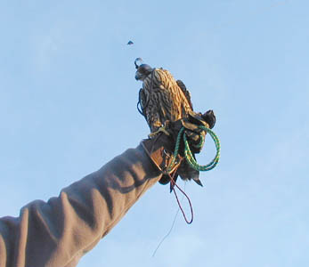 Dan, I really enjoyed your web site and could write a short stint about experiences with "Dennis," a male Saker who never really excelled, but I managed to get him to 1000 feet in a week. He climbs to that height in less than 5 minutes under all conditions and is majorly committed to his task and gets excited with the sound of the rustling nylon. He was extremely scared of the kite at first so it was by no means a completely simple task, but once the connection had been made he was dead on. I will wait and see how things develop as there is more than just getting a bird to mount, but it might be interesting to see whether I can turn around an old dog to some new tricks. So far he has developed enormously, but if I can sustain the high mounting he might start catching things consistently which would be quite a novelty for Saker Falcons in Britain. Best wishes, M.G.
